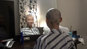 女子高生の制服を着たるーいんちゃんが手鏡を見ながら自分で断髪、剃髪。